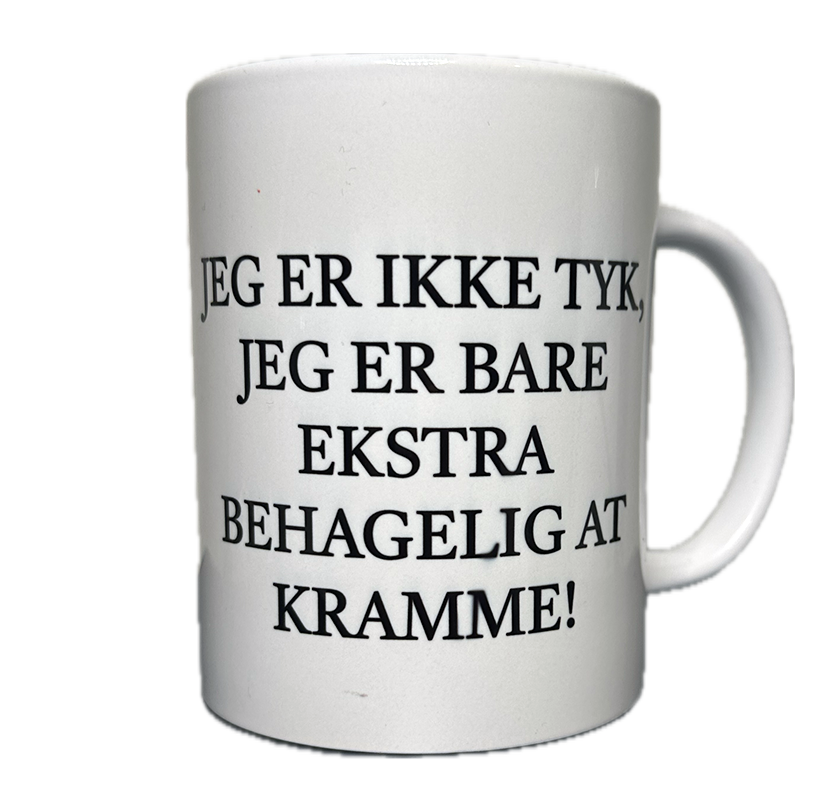 Her er koppen til dig, der elsker humor og kram! “JEG ER IKKE TYK, JEG ER BARE EKSTRA BEHAGELIG AT KRAMME” er et unikt design, perfekt til morgenkaffen og som gave til én, der kan tage sjovt på sig selv. Kun 5 stk. tilgængelige – skynd dig, før den er væk!