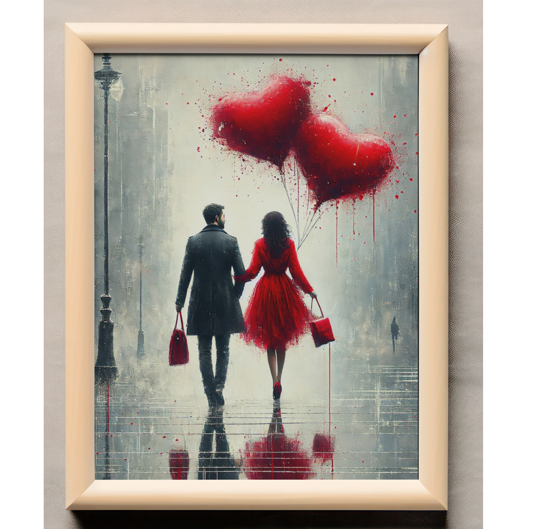 Skab en stemningsfuld og romantisk atmosfære med denne smukke kunstplakat. Billedet fanger et kærligt øjeblik mellem et par, der går hånd i hånd gennem en regnfuld by, omgivet af røde hjerteformede balloner. De stærke kontraster mellem den sort-hvide baggrund og de dybrøde detaljer giver motivet en moderne og melankolsk charme.